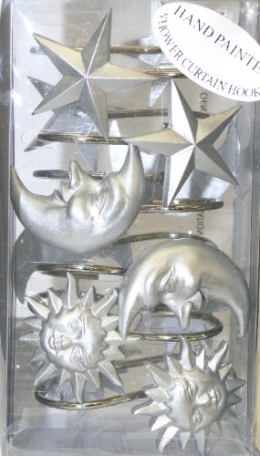Set of 12 shower hooks in silver featuring suns, moons, and stars.